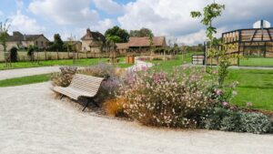 Oxalis a réalisé un aménagement en harmonie avec l’existant, intégrant une aire de jeux conçue avec des matériaux naturels, ainsi que du mobilier urbain, des plantations et des zones engazonnées.